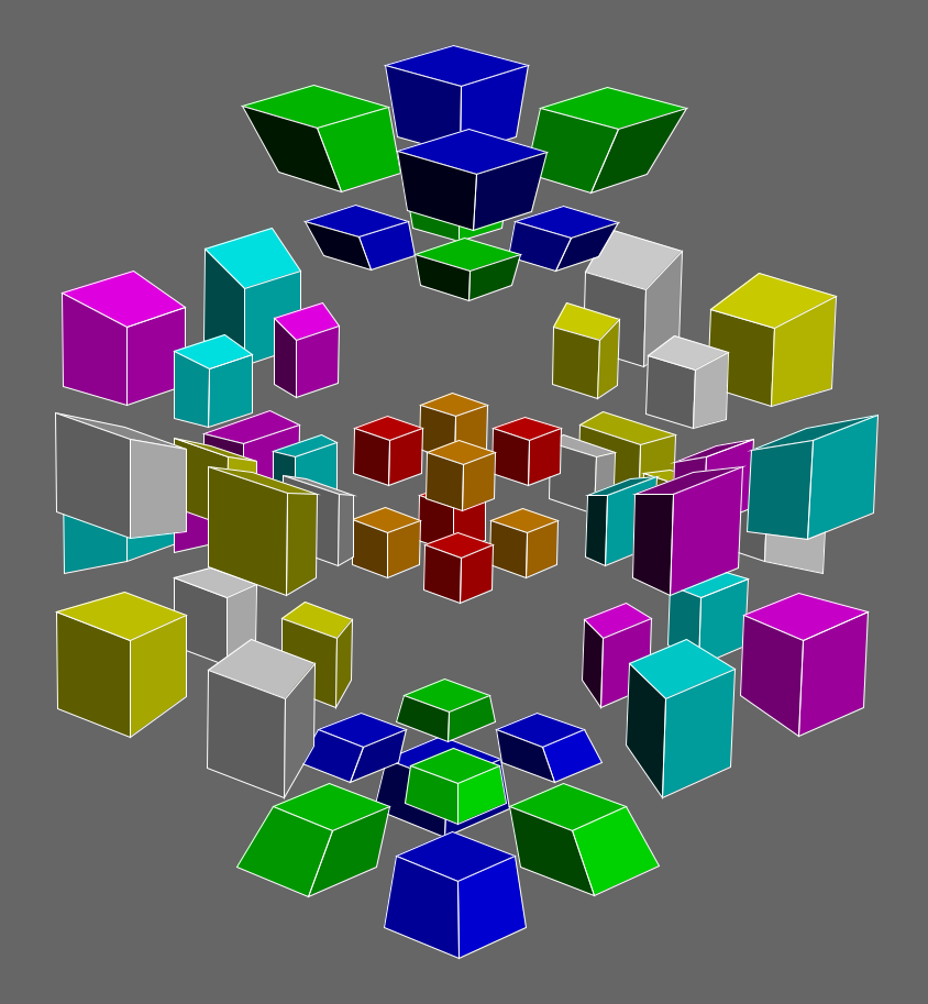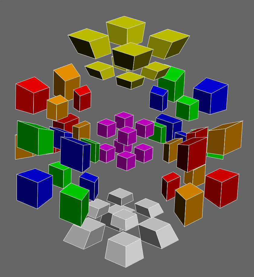 Something that can be looked into would be whether or not the full opposite checkerboard pattern can be made on every \(n^{2m}\) twisty puzzle, for \(n \ge 2, m \ge 2\), in a way similar to that described above. For example, can one parse a six-dimensional 3^6 twisty puzzle as a regular {4}x{4}x{4} in order to generate a full opposite checkerboard pattern on it, by repeating some pattern over three mutually perpendicular rings of four 5-cubes?